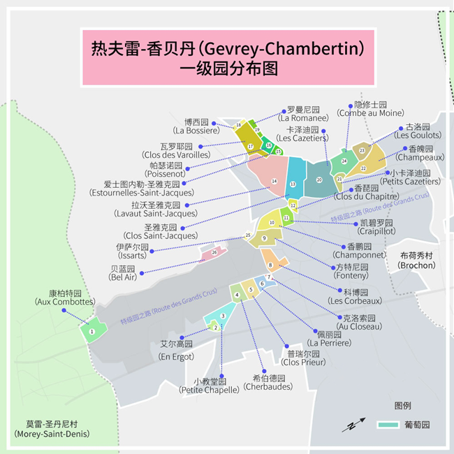 此外,勃艮第還有數(shù)個大大小小的村莊,不同村莊衍生出了不同的法定產(chǎn)區(qū),各個村莊獨特的風土也為這些村莊刻上不同標簽。比如,提到熱夫雷-香貝丹(Gevrey-Chambertin),就會讓人想到強勁、飽滿、豐富和堅實的結構,以及極強的陳年能力。提到香波-慕西尼(Chambolle-Musigny)就讓人想到優(yōu)雅與精致。