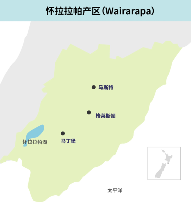 懷拉拉帕位于新西蘭北島的最南端,坐落在該國(guó)首都惠靈頓(Wellington)的東部,其名“Wairarapa”在毛利語(yǔ)中意為“閃閃發(fā)光的水域”。懷拉拉帕產(chǎn)區(qū)的葡萄種植面積很小,僅占新西蘭葡萄種植面積的3%,出產(chǎn)的葡萄酒占該國(guó)總產(chǎn)量的1%。