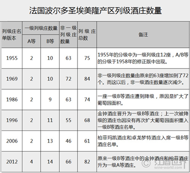 右岸的圣埃美隆葡萄酒商會在上世紀50年代決定起草一份列級酒莊分級制度,分為兩大等級,一個是分為A、B兩等的一級列級酒莊(Premier Grand Cru Classe),另一個是列級酒莊(Grand Cru Classe)。與1855年波爾多分級體系不一樣的是,圣埃美隆酒莊的評級結果并不是一成不變的。