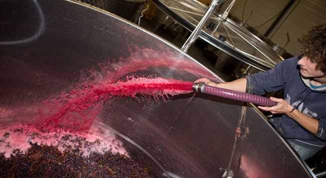 淋皮:利用泵將發酵中的葡萄汁從發酵罐底部抽至頂部往下淋,將酒帽淋透。