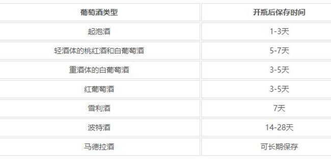 不同類型的葡萄酒,其開瓶后能夠保存的時間也不一樣。具體如下: