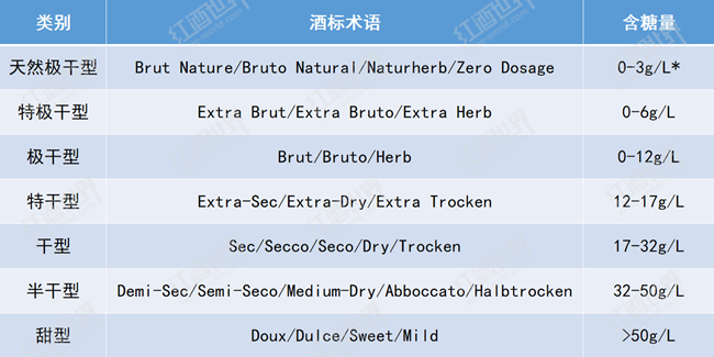 與靜止酒不同,起泡酒根據(jù)糖分含量對葡萄酒的劃分更為細致,含糖量由低到高可分為天然極干型、特極干型、極干型、特干型、干型、半干型和甜型七個類型。在使用傳統(tǒng)法(Traditional Method)、轉(zhuǎn)移法(Transfer Method)或罐中發(fā)酵法(Tank Method)釀造起泡酒時,酒液在最終封瓶或裝瓶前,都會使用由酒液和糖組成的調(diào)味液(Liqueur d'Expedition)進行補液,調(diào)味液中的糖分含量便決定了最終成酒的含糖量,而天然極干型起泡酒在補液時不允許添加糖分,因此最終成酒糖分含量僅在0-3g/L之間。阿斯蒂起泡酒的糖分含量則由酒精發(fā)酵終止時酒中的殘?zhí)橇繘Q定。