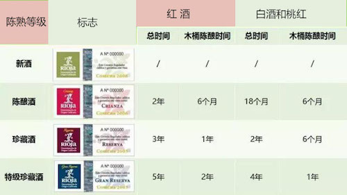 其中,里奧哈葡萄酒又分為Generic(原產(chǎn)地/新酒), Crianza(陳釀), Reserva(珍藏)和Gran Reserva(特級(jí)珍藏)。上述四個(gè)等級(jí)都是以橡木桶陳釀與瓶陳時(shí)間進(jìn)行的劃分。