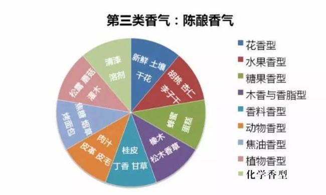 三類香氣是指葡萄酒在陳釀過程中所發(fā)展出來的香氣。當(dāng)葡萄酒被長時(shí)間保存在橡木桶中時(shí),陳釀過程的氧化作用會(huì)給葡萄酒增加如咖啡、太妃糖、焦糖等第三類香氣。而當(dāng)葡萄酒被長時(shí)間保存在酒瓶中時(shí),雖說不再有氧化反應(yīng),但也會(huì)發(fā)展出如汽油、蜂蜜、蘑菇等第三類香氣。在這個(gè)過程中,葡萄酒中的一、二類香氣會(huì)與微量的氧氣接觸發(fā)生氧化反應(yīng),發(fā)展出動(dòng)物皮革、蘑菇、煙草和森林地表等氣息。而清新的果香也會(huì)演化成果醬的味道。這些香氣是一些老年份葡萄酒帶給我們的美好享受。