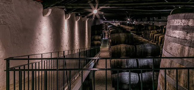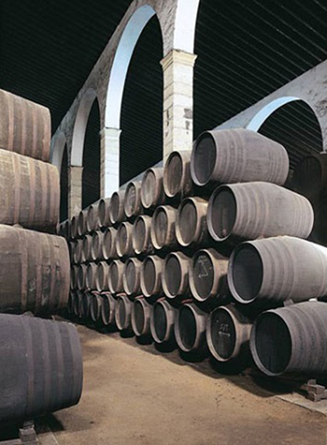 雪莉酒的強(qiáng)化發(fā)生在基酒發(fā)酵結(jié)束后,一般通過(guò)混入部分酒精濃度高達(dá)96%abv的蒸餾烈酒來(lái)將葡萄酒的酒精度提升至15-15.5%abv或17%abv。然后,酒液會(huì)轉(zhuǎn)入獨(dú)特的索萊拉(Solera)系統(tǒng)進(jìn)行熟化。這種系統(tǒng)的特點(diǎn)在于將不同熟化期的酒液分層存放,然后在熟成過(guò)程中每隔一段時(shí)間就將年輕酒液與熟化較久的酒液混合,以保證每次釀出的雪莉酒風(fēng)格一致,且品質(zhì)穩(wěn)定。雪莉酒的風(fēng)味大多源自該熟化階段,其風(fēng)格也與熟化時(shí)長(zhǎng)和熟化方式等息息相關(guān)。