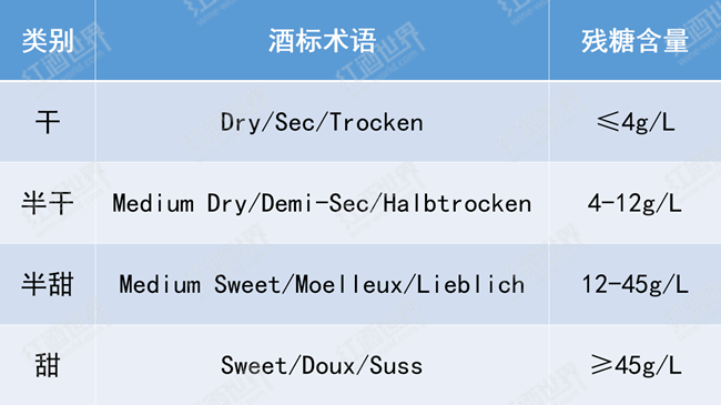 根據(jù)酒液中的殘?zhí)橇?,人們將靜止葡萄酒分成了四個類別:干型(Dry)、半干型(Medium)、半甜型(Medium Sweet)和甜型(Sweet)。