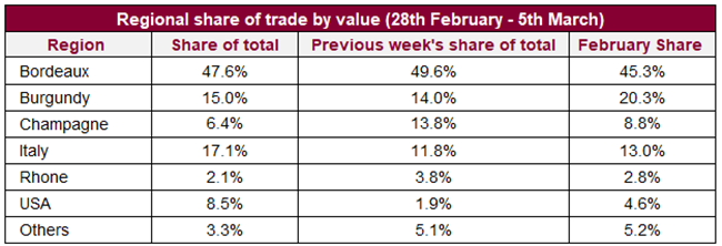 就交易總值份額而言,波爾多(47.6%)連續(xù)第二周低于指標(biāo)50%。 免關(guān)稅的意大利份額則躍升(17.1%);當(dāng)中2016年份占了該酒區(qū)交易超過55%。
