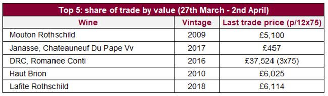 本月五大最高交易總值葡萄酒,分別來自三大一級(jí)酒莊、南羅納和勃艮第;而前十位也全是法國(guó)葡萄酒。 盡管波爾多(45.9%)份額保持不變,但勃艮第份額(12.5%)也有增長(zhǎng);這主要是受其白葡萄酒的交易增長(zhǎng)所推動(dòng)。