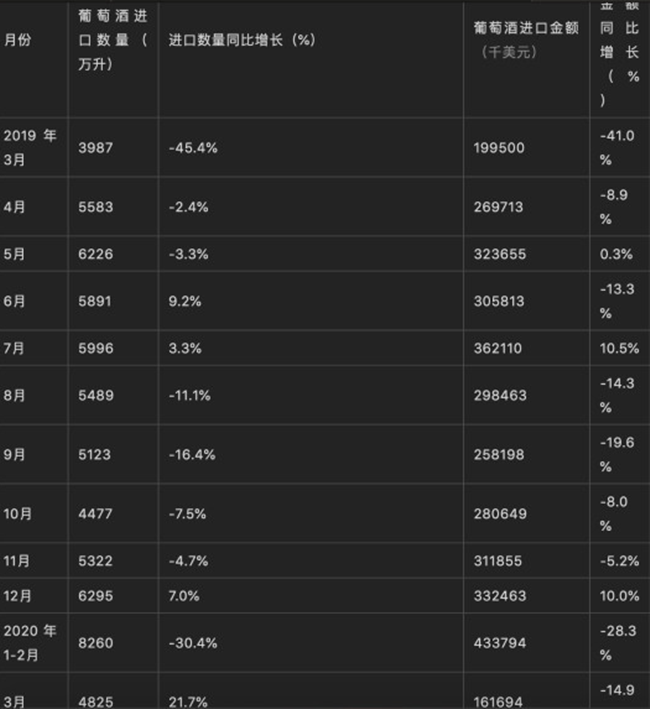 單從2020年3月來(lái)看,中國(guó)葡萄酒進(jìn)口量為4825萬(wàn)升,同比增長(zhǎng)21.7%;進(jìn)口金額為161694千美元,同比下降14.9%。