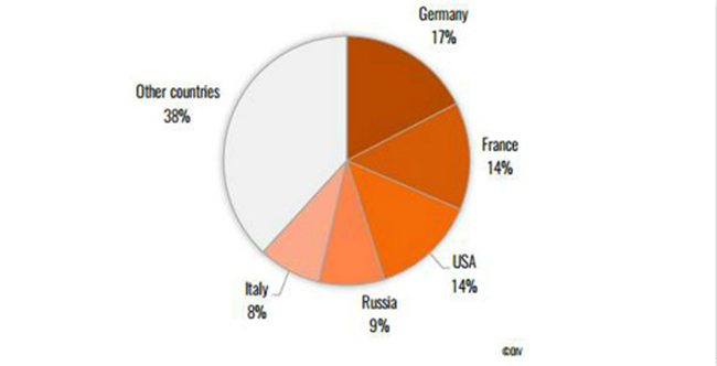 按價值計算,美國是最大的進口國(11.12億歐元),其次是英國(7.23億歐元),日本(5.23億歐元),德國(4.25億歐元),新加坡(3.08億歐元)。自2008年,美國、日本市場有了顯著增長,年平均增長率分別為9%和7%。