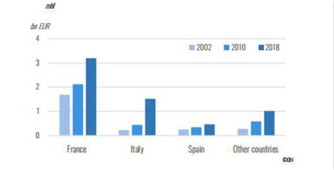 德國位列第三位,2018年的起泡葡萄酒產量2.8億升,略低于平均水平。起泡酒生產占到了總產量的28%,這一比例在所有起泡酒生產國中是最高的。