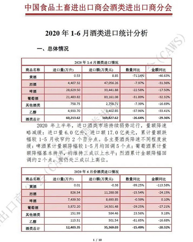 2020年上半年,進(jìn)口酒類(lèi)市場(chǎng)持續(xù)弱勢(shì)運(yùn)行,量額降幅略減緩:進(jìn)口量6.0億升,進(jìn)口額17.0億美元,累計(jì)量額跌幅較1-5月收窄約2個(gè)百分點(diǎn)。其中,上半年葡萄酒進(jìn)口量2.1億升,進(jìn)口額8.3億美元,累計(jì)量額降幅維持三成以上水平,在酒類(lèi)進(jìn)口總額中占比下滑至49.9%。
