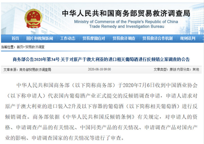 根據(jù)上述審查結(jié)果,依據(jù)《中華人民共和國反傾銷條例》第十六條的規(guī)定,商務(wù)部決定自2020年8月18日起對原產(chǎn)于澳大利亞的進(jìn)口相關(guān)葡萄酒進(jìn)行反傾銷立案調(diào)查。現(xiàn)將有關(guān)事項(xiàng)公告如下: