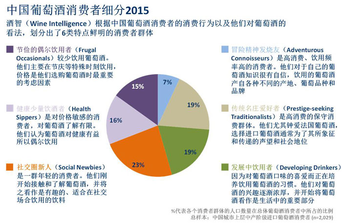 針對中國的3800萬進口葡萄酒消費者,酒智(Wine Intelligence)劃分出了6類特點鮮明的消費者類別。除了上述提及的 “發(fā)展中飲用者”(Developing Drinkers),其他5類包括“冒險精神發(fā)燒友”(Adventurous Connoisseurs)、“傳統(tǒng)名莊愛好者”(Prestige-seeking Traditionalists)、“社交圈新人”(Social Newbies)、“健康少量飲酒者”(Health Sippers)和“節(jié)儉的偶爾飲用者”(Frugal Occasionals)。酒智(Wine Intelligence)的消費者劃分不僅基于年齡、性別和收入等基本信息,還涉及消費者的購買飲用行為以及他們對于葡萄酒的看法,包括:他們?yōu)楹物嬘闷咸丫疲绾巫龀鲑徺I決定,以及飲用何種葡萄品種和產(chǎn)地等等。