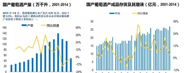 回顧國(guó)產(chǎn)葡萄酒的發(fā)展,在經(jīng)歷近十年產(chǎn)量年均17%的高速增長(zhǎng)后,2012年到達(dá)頂峰;行業(yè)收入在2001-2012年間年均復(fù)合增速達(dá)23%;2013年,經(jīng)濟(jì)維持低景氣,“三公消費(fèi)”限制加劇,行業(yè)量?jī)r(jià)齊跌,處于景氣低谷;同時(shí)產(chǎn)成品同比增速額和庫(kù)存壓力處于歷史高位,產(chǎn)量、行業(yè)收入和利潤(rùn)均出現(xiàn)大幅下滑。但經(jīng)過(guò)2014年的庫(kù)存消化,行業(yè)產(chǎn)成品存量增速逐步放緩,產(chǎn)量下降速度也開(kāi)始減緩,收入和利潤(rùn)出現(xiàn)回升。