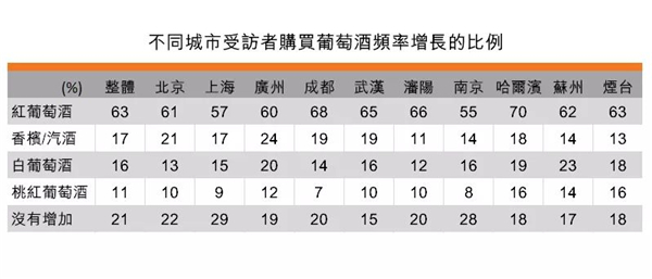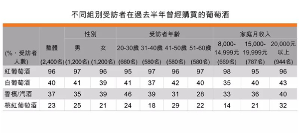 這次調(diào)查把葡萄酒分為四大類別:紅葡萄酒、白葡萄酒、桃紅葡萄酒及香檳及起泡酒。數(shù)據(jù)顯示: