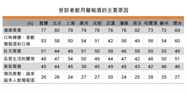 根據(jù)調(diào)查顯示結(jié)果,近年來內(nèi)地消費者對飲用葡萄酒的態(tài)度觀念有所改變。以往飲用葡萄酒主要是商務(wù)應(yīng)酬或社交需要,現(xiàn)在則有77%表的受訪者表示飲用葡萄酒的原因是健康需要;53%表示口味轉(zhuǎn)變,喜歡葡萄酒的口感。只有51%受訪者表示飲用葡萄酒是因為社交需要;而受潮流影響的則只有26%。
