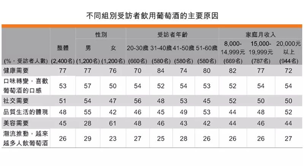 若以受訪者年齡區(qū)分,31-40歲受訪者中有84%表示飲用葡萄酒的主要原因是健康需要,明顯高于其他年齡段的受訪者。若以家庭月收入?yún)^(qū)分,家庭月收入在8,000-14,999元組別的受訪者有82%表示,飲用葡萄酒的主要原因是健康需要,明顯高于家庭月收入在20,000元以上的組別的72%。