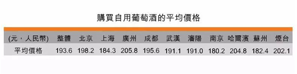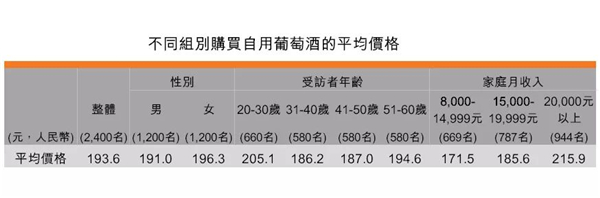 調(diào)查顯示,女受訪者購買自用葡萄酒的平均價格為196.3元,略高于男受訪者的191.0元。20-30歲消費者容易接受較高價格的葡萄酒,因為他們購買自用葡萄酒的平均價格為205.1元,相對其他年齡組別高。隨著家庭月收入上升,受訪者購買自用葡萄酒的價格也同時提高。