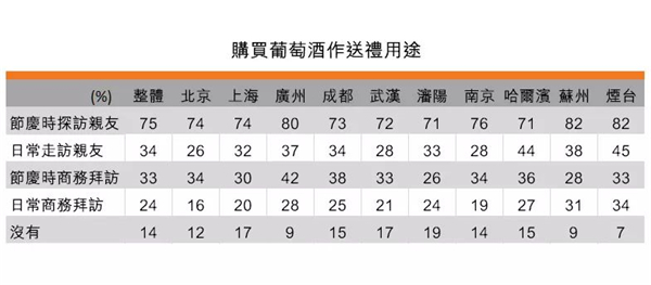 在受訪者中,有86%的人曾購買葡萄酒送禮,其中,75%的人選擇在在慶探訪親友時曾購買,34%的消費者為日常走訪親友,33%為節(jié)慶商務(wù)拜訪。