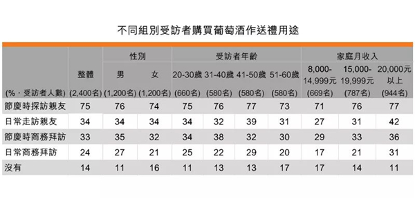 若以受訪者年齡區(qū)分,年輕受訪者以葡萄酒作為送禮用途的比例較年長受訪者高。例如20-30歲受訪者中有89%表示曾購買葡萄酒作為禮物,而51-60歲受訪者中則有83%。另外,家庭月收入越高,購買葡萄酒作為禮物的比例也越高。家庭月收入20,000元以上的受訪者中有89%表示有購買葡萄酒作為禮物,而家庭月收入在8,000-14,999元的則有83%。