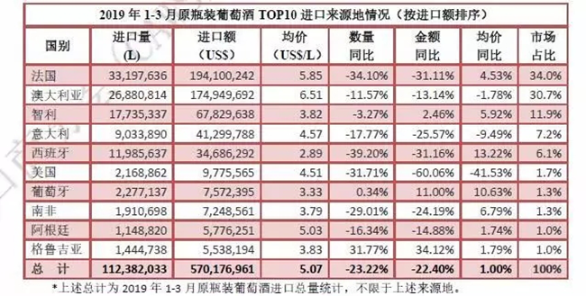 近些年來,新世界葡萄酒異軍突起,以澳洲酒為代表的新世界葡萄酒成為葡萄酒酒世界的一匹黑馬,迅速的占領(lǐng)著全球市場。不過從原裝進(jìn)口來看,法國依舊占據(jù)著榜首。2019年一季度法國向中國出口了價(jià)值3.32 億美元的原瓶裝葡萄酒,占據(jù)了34%的市場份額。 高于澳大利亞30.7%的市場占比。