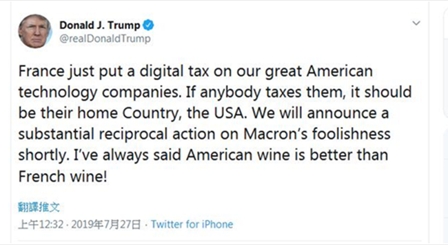 作為對法國近期宣布對全球科技巨頭征收數(shù)字服務稅的回應,據美國《紐約時報》報道,特朗普26日先是在推特上表示,“法國剛剛對我們偉大的美國科技公司征收一項數(shù)字稅,如果說有人要向他們征稅,那也應該是他們的祖國——美國。”