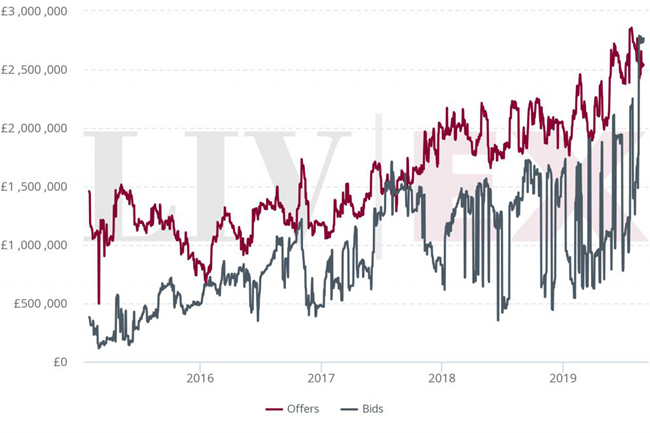 如上圖所示,早于2015年,意大利的出價和報價總值已接近200萬英鎊。 現(xiàn)在,這數(shù)字更已超過500萬英鎊,很大程度上是由活躍買家所推動; 由此可反映市場對意大利葡萄酒的興趣日增。
