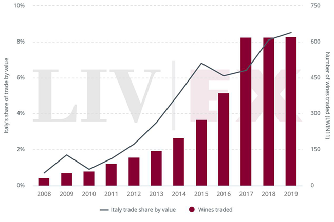 市場對意大利葡萄酒的興趣日益,這可從曝光率(出價和報價的總值)不斷上升上體現(xiàn);這是市場上買賣葡萄酒的承諾指標。