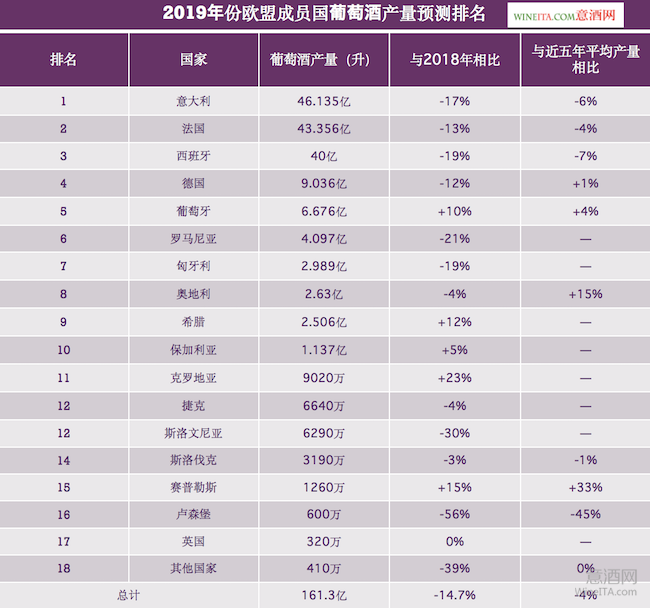 在歐盟成員國中,葡萄酒產量呈現最大降幅的是盧森堡,約為600萬升,較2018年減少56%,較近五年平均產量減少45%。