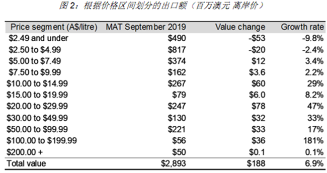 截至2019 年9 月底的12個月中,澳大利亞葡萄酒對中國市場 (包括香港和澳門)的出口額持續(xù)增長18%,創(chuàng)下12.5 億澳元新高,平均出口額上漲了40%至8.42 澳元/升(離岸價)。