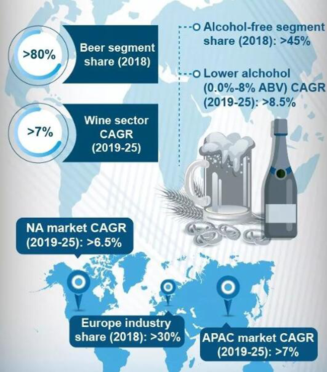 根據(jù)全球市場洞察(Global Market Insights)2019年發(fā)布的報(bào)告,2018年無醇葡萄酒和無醇啤酒市場規(guī)模為200億美元,預(yù)計(jì)從2019年到2025年,年復(fù)合增長率將超過7%,達(dá)300億美元,以下是部分?jǐn)?shù)據(jù):