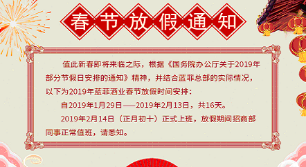 • 尊敬的藍菲代理商、經銷商們: 值此新春即將來臨之際,藍菲酒業全體員工提前祝大家:新春快樂,闔家幸福。 自2019年1月29日2019年2月13日,共16天,為 藍菲酒業 春節假期,于2019年2月14日(正月初十)正式上班,放假期間公司安排人員正常值班,請悉知。 新春...